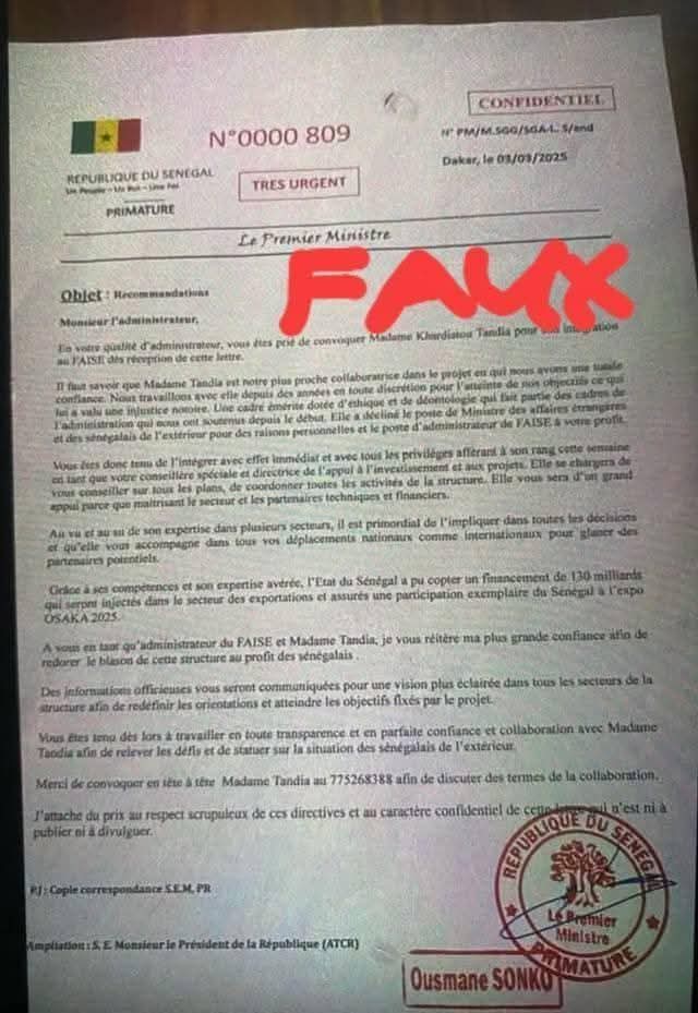 Avec le changement de pouvoir et l’avènement du duo Diomaye-Sonko, Khadidiatou Tandia aurait tenté de s’introduire au Faise en se présentant comme une proche du nouveau régime. Elle aurait obtenu une audience avec Khoureychi Thiam, le nouveau Directeur général et lui aurait remis une lettre qu’elle affirmait être une recommandation signée par Ousmane Sonko en personne. Dans cette missive, Sonko exigerait son installation immédiate en tant que “Directrice de l’Appui à l’Investissement et aux Projets”.